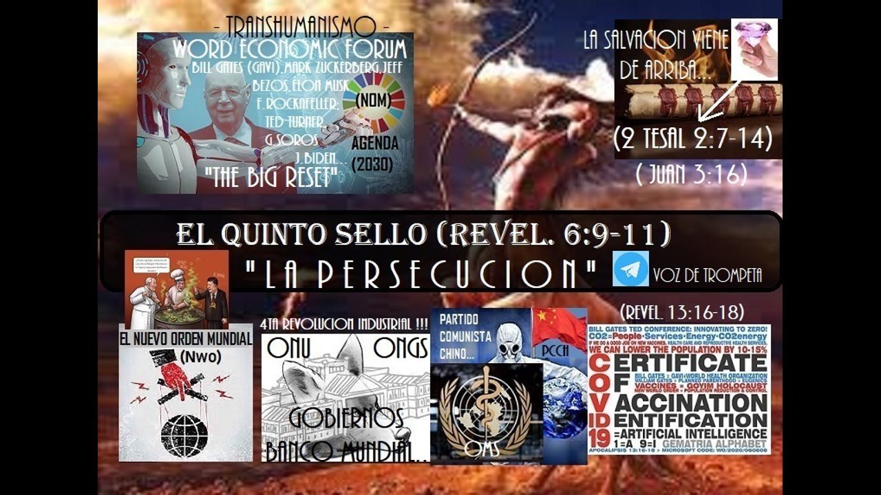 Alerta IGLESIA de CRISTO: el 5to sello del libro de revelaciones habla de persecuciones. Esta PERSECUCION sin precedentes en la historia de la humanidad como la que estamos viviendo hoy en el mundo con la llamada "VACUNA" del NUEVO ORDEN MUNDIAL pero especialmente contra el REMANENTE de JESUS que entiende que es "TEMPLO" de un DIOS VIVO, del "ESPIRITU SANTO de DIOS" y que conoce la "VOLUNTAD de DIOS para su PUEBLO" así como los "TIEMPOS DEL FIN" hace parte del 5to sello? El libro del profeta Daniel habla de tiempo de angustia antes de la redención de Su pueblo. Dijo el SEÑOR JESUS a sus DISCIPULOS y también a NOSOTROS: "Cuando ESTAS COSAS comiencen a SUCEDER, erguíos y "LEVANTAD vuestra CABEZA, porque vuestra REDENCION está CERCA". (Lucas 21:28). Glorias a Dios. Aleluya.
