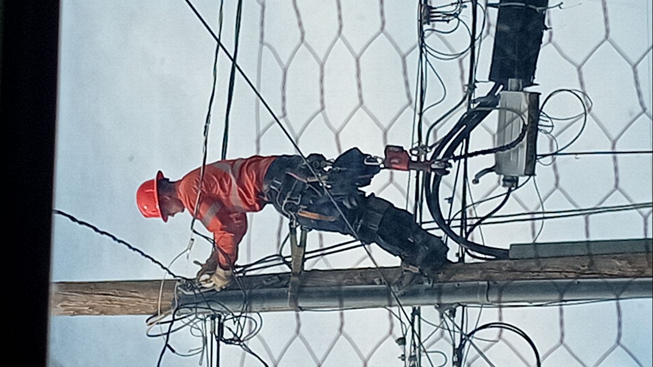 A couple of SaskPower men working hard and doing some pole climbing.