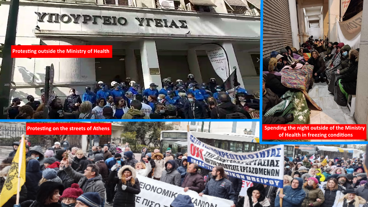 The health workers have been protesting, 24/7, for more than a month now, outside the Ministry of Health in downtown Athens