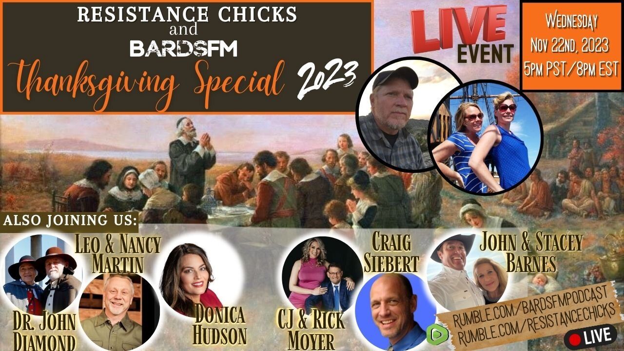 Join us LIVE for a BardsFM & Resistance Chicks Thanksgiving special! Celebrating the Christian Miracles surrounding the birth of this great nation! Tonight we are joined by a reunion of some of The Covenant: Restoring the Ancient Paths friends including pilgrim historians, Leo & Nancy Martin of the Jenney Museum in Plymouth, MA, Dr. John Diamond host of America Unhinged, author of Pray America Great, Donica Hudson, historian Craig Seibert and NEW friends, Pastors CJ & Rick Moyer! You don't want to miss this JAM-packed show where we will honor our forefathers and give THANKS for all God is doing in this Nation and around the world! More Info from todays show with links for watch to watch on Thanksgiving: