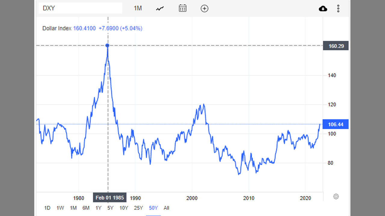 Thumbnail: US Dollar 50-year chart. US Dollar hit November 2002 (20-year highs on July 5, 2022). Money flows into the US Dollar from around the world full-steam ahead.