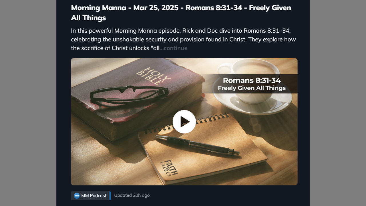 In this powerful Morning Manna episode, Rick and Doc dive into Romans 8:31–34, celebrating the unshakable security and provision found in Christ. They explore how the sacrifice of Christ unlocks "all things" for believers—salvation, provision, and victory over accusations. The lesson stresses leaning into God’s generosity and Jesus’s ongoing intercession. They also remind us that if God gave His Son, He will certainly provide for all our needs. Be encouraged to rest in God’s finished work and walk confidently in His grace.