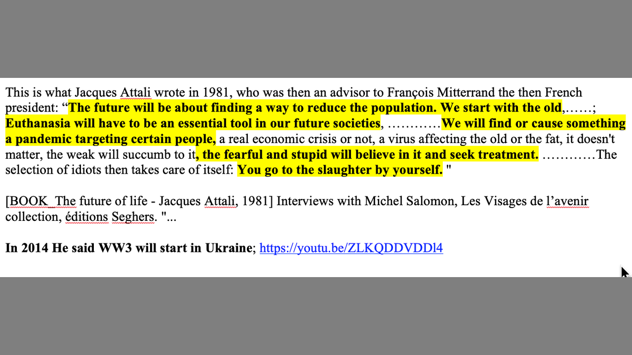 This is what Jacques Attali wrote in 1981, who was then an advisor to François Mitterrand the then French president: “The future will be about finding a way to reduce the population.