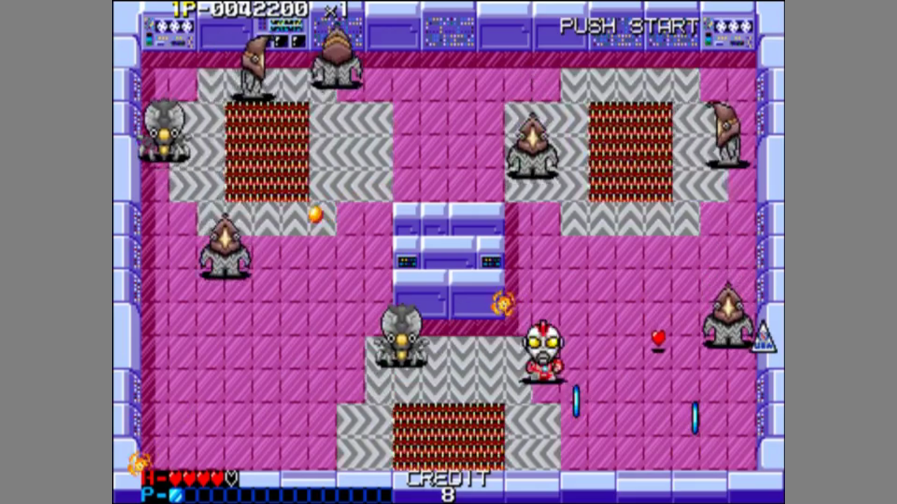 There are eight worlds divided into six stages each. Each stage consists of single screen. You control your character from a top-down view. Each stage is riddled with enemies, and you need to kill off all enemies. Some stages also have generators which spawn enemies until you destroy them. Your character has a beam attack with limited reach and a special attack which has no limited reach and also goes through walls. The special attack needs energy, which is indicated by a gauge. You can refill the gauge by collecting blue or golden medals. There are eight characters to choose from. Each has different attacks and differs in terms of health and speed. Items, like the medals, are dropped by enemies when you hit them. Most of them only give points, but one calls an aerial strikes which destroys all enemies in its path. Hearts restore health.