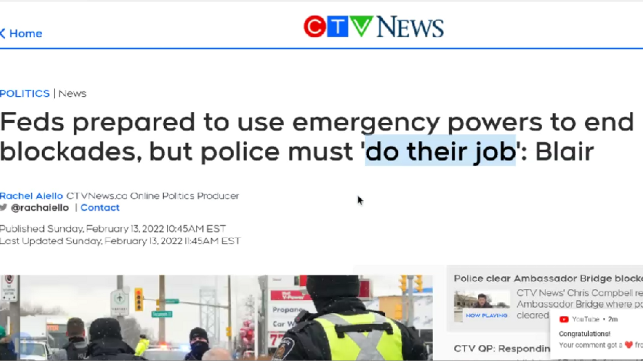 I live in Toronto and I have been following the Truckers Freedom Convoy since they left British Columbia over three weeks ago. I have also been watching how the police in various duristictions have been treating the Convoy. Now that the Truckers have set-up shop in Ottawa I have been watching how the various police factions (Ottawa, O.P.P., RCMP, Toronto, Durham, York, London, etc.) have been treating the Convoy. Outside of the old man getting roughed up and arrested for honking his horn, the dude in the green pick-up getting arrested for being runned into by a cop car, the cops raiding the base camp and stealing the gas cans, etc. the police have been very stand backish to the convoy. Yesterday was by far the busiest Saturday in Ottawa and there was barely a cop to be seen. Which leads me to this. In the video I discuss why the Trudeau government is trapped in a rock and a hard place because the various police department's (outside) of the RCMP DO NOT want to get involved in removing the Truckers and that has Trudeau's Emergency Preparedness Minister and former Toronto Police Chief Bill Blair very concerned as you will hear me discuss in this video.