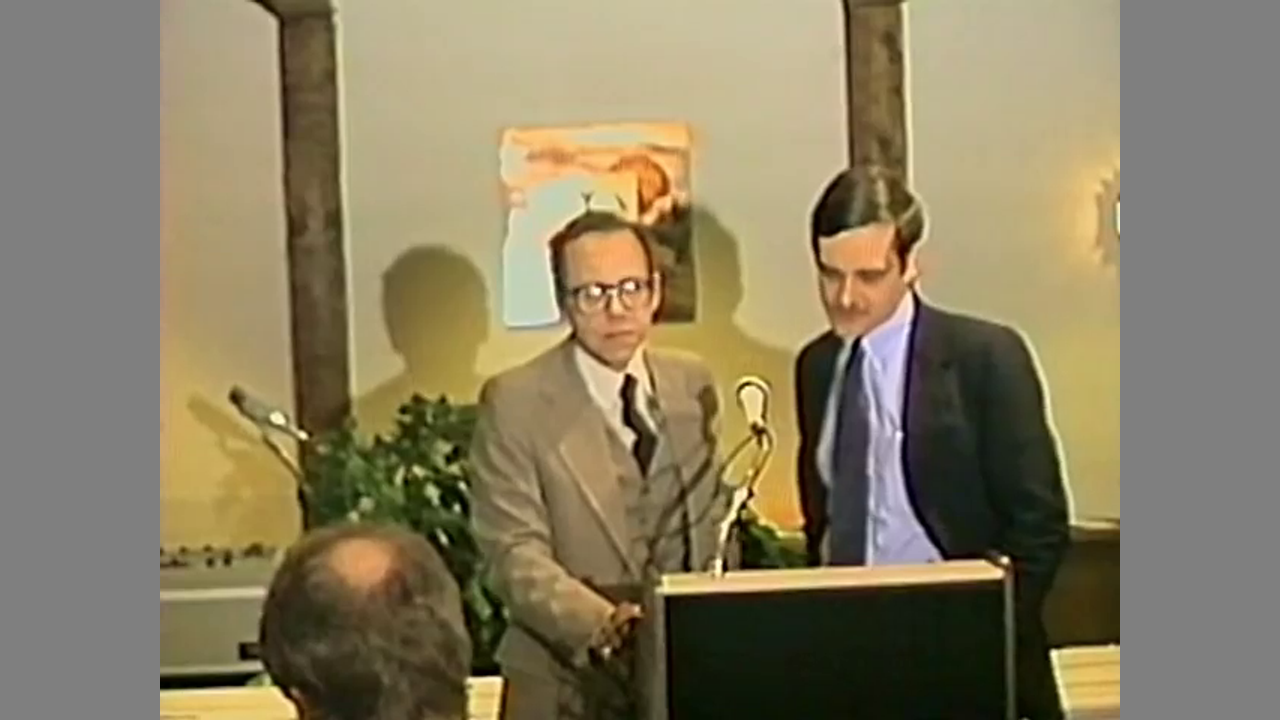 Revisionist gas chamber expert Fred Leuchter relates his liberating information to a German audience in English and historian Mark Weber translates into German.