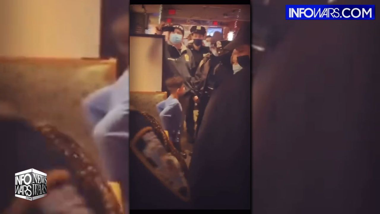 Alex Jones presents shocking footage out of New York City shows a squad of NYPD officers breaking up a child’s birthday party over their lack of vaccine passports.