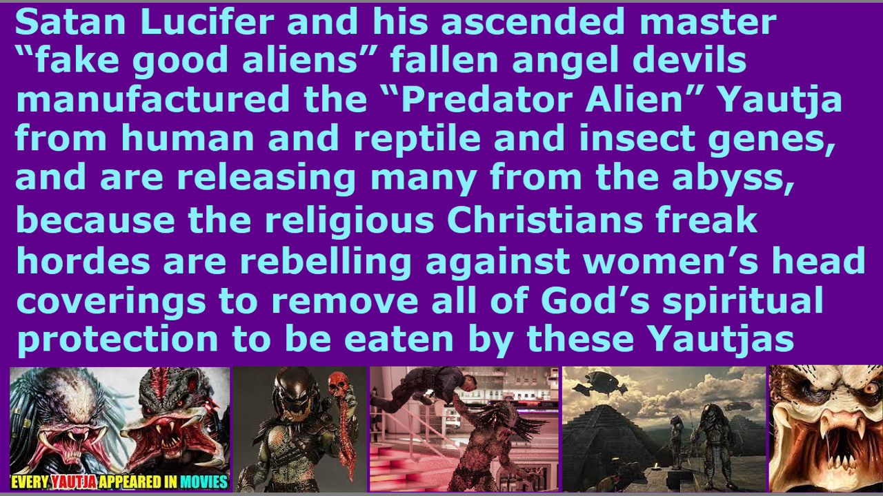 Satan Lucifer and his ascended master “fake good alien” fallen angel devils manufactured the “Predator Alien” Yautja from human and reptile and insect genes, and are releasing many from the abyss, because the religious Christians freak hordes are rebelling against women’s head coverings to remove all of God’s spiritual protection.