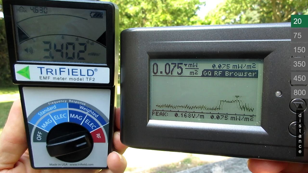 Some devices that don't seem to measure much from the chosen source (169 MHz paging), may be under-reporting because their frequency response falls off at some point (here are the claims of the start of frequency response of the least responsive devices: 200MHz for the SaSC2, 100MHz for the Cornet ED88T, 1 MHz for the Cemprotec 34. Keep in mind that it's likely that specifications are exaggerated (incorrect) for some of these devices). It is also possible that the Trifield TF2 and Esmog Spion 5G are over reporting, however, it may just be that their frequency range covers this 169 Mhz better so they measure more correct (the Trifield TF2 claims to start from 20MHz, the Esmog Spion 5G claims from 50 MHz or 200MHz depending on connected antenna). The answers could be found out with professional testing equipment (like seen in the tests linked to below).