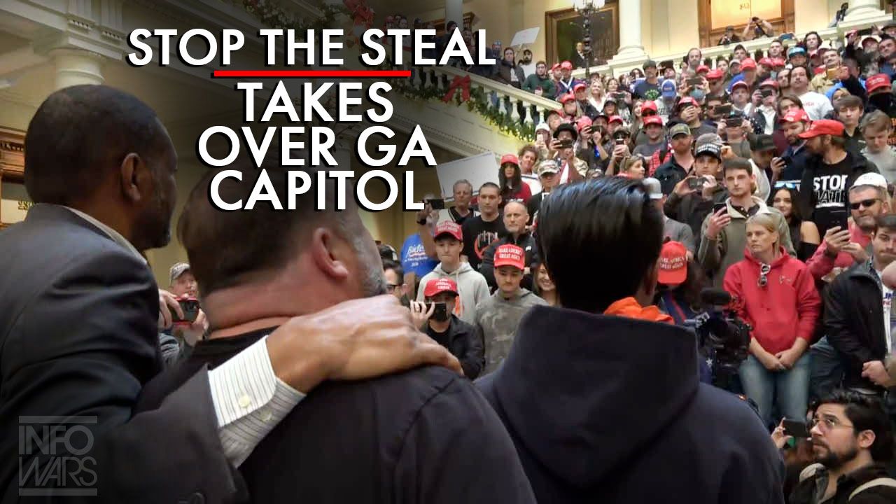 Alex Jones is joined by Ali Alexander and Georgia State Rep. Vernon Jones as the #stopthesteal protest takes over the steps of the Georgia State Capitol.