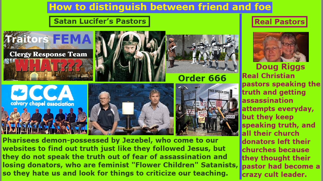 Intelligence information on enemy movements report that their 1.6 million “Clergy Response Team” “Order 666” church pastor FEMA officers have been activated by the Draco avatar Nazi SS Donald Trump. They are not pastors but they are hired shill FEMA officers. The religious Christians love these fake-human nephilim & chimera alien incarnate avatar Satanist witch church pastors, and pay billions of dollars of donations to them every year. They hate the original unaltered Bible verses we real Christians teach, because they believe the Bible verses and the Word of God who is Jesus is evil and politically incorrect and old-fashioned and literalist and legalistic and not applicable to the End Times modern apostate Church. They believe it is not in line with their Jezebel goddess’ Western feminist nation ideologies of Satanism and Sananda Jesus god’s doctrines. The Western feminist nations’ religious Christian hordes choose what Bible verses are taught to them, because it is a democratic church and not God’s theocratic church. It is laughable and an insult to God that their Calvary Chapel New Age Wicca witch “Flower Children” “Jesus movement” Satanist churches’ slogan is “Simply teaching the Bible simply.” The NWO nephilim & chimera alien incarnate avatar globalist elites are preparing for their pastors to slaughter the millions and millions of Western feminist nations’ “Bible redefining” “women’s head coverings rebelling” “Satan Lucifer’s 1840s to 2020s cross-dress-project men’s trousers wearing” “10% salary tithe taxing” “Post Pan Pre-Wrath Tribulation Rapture Theories lies AntiChrist fake millennial kingdom of Christ” religious Christian convert hordes (the group that Donald Trump calls “Drain The Swamp”). Only the real Christians are restraining this slaughter until they finish their warning and are raptured into heaven. Then, God will allow the “Clergy Response Team” church pastors and AntiChrist to behead the millions and millions of “Post Pan Pre-Wrath Tribulation Rapture Theories“ “head covering rebelling” “cross-dressing” religious Christians. Then the Pedogate Pizzagate “White House Pizza Night” pedophile cannibal nephilim giants will be allowed to appear out of their underground bases, after we real Christians are raptured into heaven. The question is: why aren’t all the pastors warning their church members that the “Clergy Response Team” executioners have been activated nationwide. Are their pastors part of the NWO? End of transmission… ***
