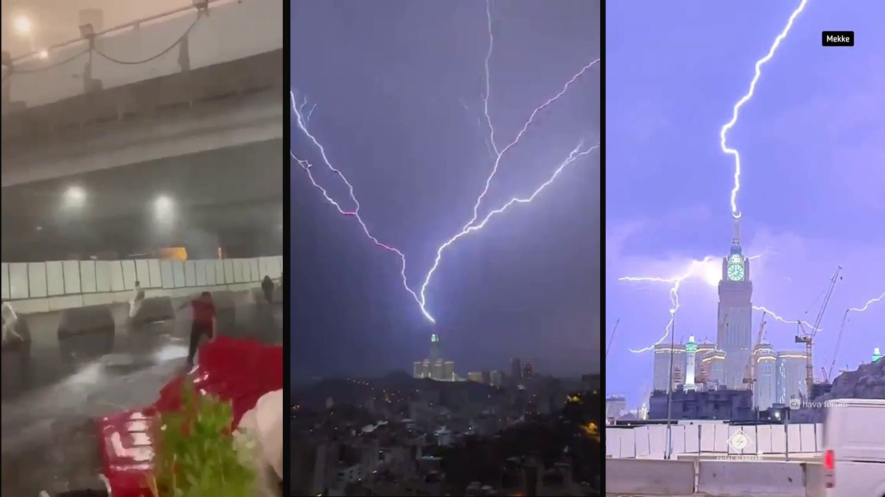 Powerful lightning strikes the Clock Tower in Mecca