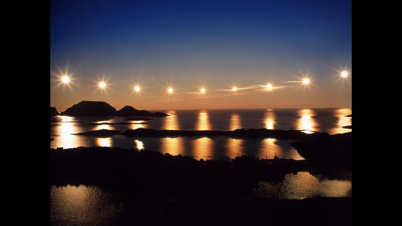 The Midnight Sun is a phenomenon experienced by observers North of the Arctic circle during Summer Solstice where the Sun can be seen circling over and around 360 degrees without ever setting. Depending how far North the observer is, the Sun can be seen for several days/weeks, rising and falling as usual but never fully setting beyond the horizon. This is because the Sun having reached the Tropic of Cancer is making its tightest, narrowest circle over the Earth, so much so that observers positioned centrally within the Arctic circle are never at any time significantly far enough away from the Sun for it to set beyond their horizon. Not until after Summer Solstice when the Sun makes its way back towards the equator will the Sun set completely and Arctic days begin getting shorter. Meanwhile in the Antarctic during Summer Solstice, the Sun disappears completely for over 2 months leaving everyone below the Antarctic circle in bitter cold darkness from mid-May to mid-July. Again, this is because the Sun narrowing and tightening its path towards the Tropic of Cancer means it has moved significantly far enough away from the Antarctic perimeter so as not to be seen by observers positioned so far South. Not until mid-July when the Sun expands and widens its path back significantly far enough will Antarctic observers again be able to see the Sun above the horizon and the Antarctic days begin getting longer.