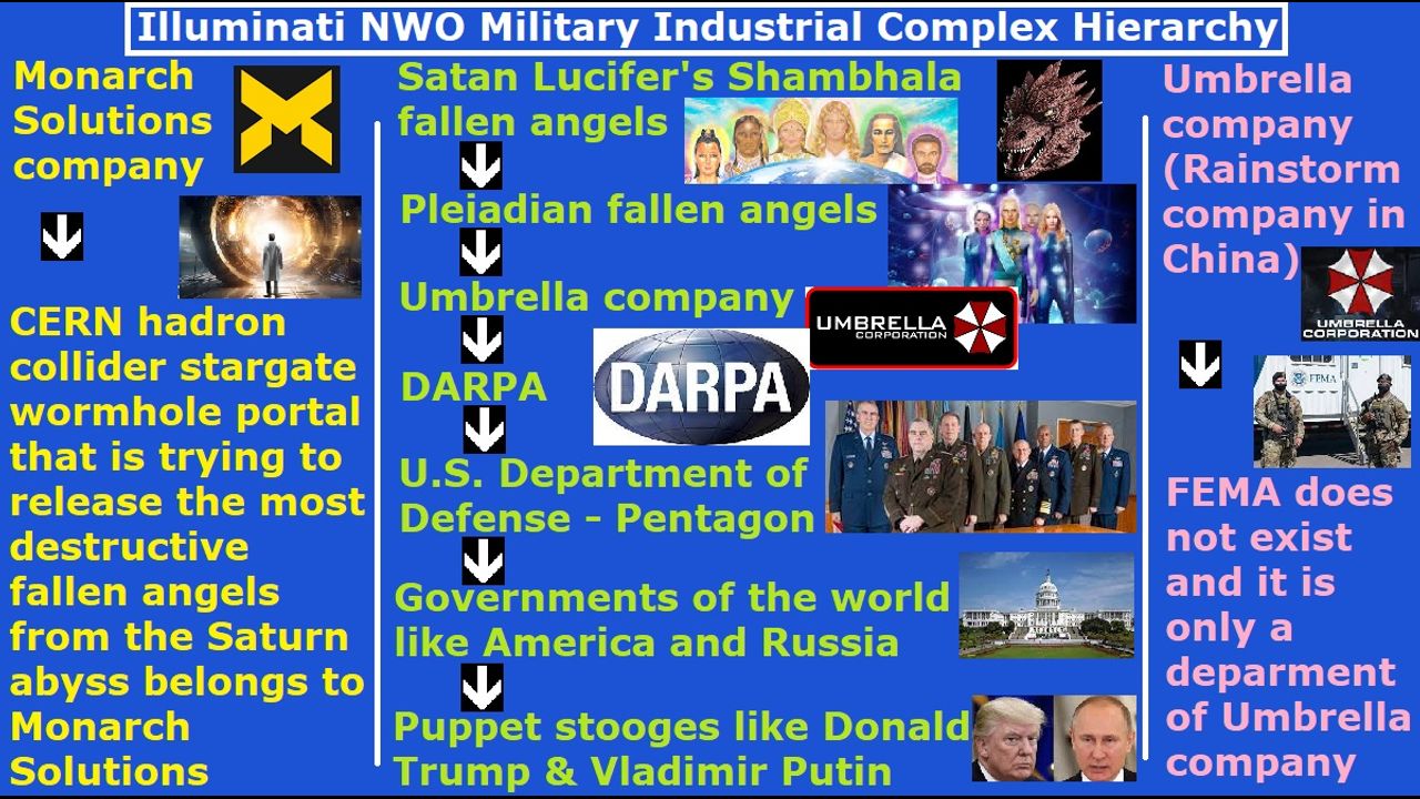 *** Intelligence news update from the Human Homo-Sapiens Race Survival Resistance (HRSR) headquarters and Republic Rebel Alliance battlefront (July 2023). Satan Lucifer’s 5,000 year old Noah’s days Atlantis Pleiadian Watcher fallen angels’ companies like Umbrella zombie virus corporation owns DARPA, which is conducting horrific biological weapon experiments on and dissecting alive 4 million human specie’s 2 to 4 year old children, and also on pregnant women. DARPA owns the United States Department of Defense. The U.S. Department of Defense owns the whole government of the United States. There is no such thing as presidents or congress or courts, because they only do official business for their D.O.D. bosses. FEMA is just a cover-up division of the fallen angels’ 5,000 year old Noah’s days Atlantis zombie virus company Umbrella Corporation. The organization called FEMA does not exist. FEMA is a fantasy fiction fake organization. The CERN stargate wormhole portal that is trying to release the most destructive fallen angels from the Saturn abyss is owned by the fallen angels’ 5,000 year old Noah’s days Atlantis company Monarch Solutions Corporation. The uroboros zombie virus and COVID fake pandemic virus manufacturing Umbrella company changed its name to Rainstorm company and moved its headquarter to China. The Umbrella company manages the millions of illegal immigrants and androids and cybernetic androids they are smuggling into the United States, and the Umbrella company biochemical weapon test balloons sent from their Chinese subsidiary companies Norinco & Rio Tinto which the American government would not shoot down, and the Sudan civil war to test their biochemical weapons, including biochemical weapon dispersions in Tanzania and Chad. They are building underground military complexes under the war zones that they create, for developing and testing military weapons and collecting human test subjects, just like the Pleiadian Nazi SS Aryan race fallen angel fake aliens’ “Shadow Group” did in the Ukraine war. There is no tracking of the human soldiers and civilians that disappear because of the war environment, just like when they are disintegrated by their particle weapons. They are using destructive anti-matter weapons, too, that leave no radiation. They go into the war zones with heavy weapons to set up their facilities by drawing attention to the wars. They used biochemical weapons in World War 1 and World War 2, and conducted horrendous biological weapon tests on the human prisoners as part of their international war crimes. They also mine plutonium and diamond in those areas like Sudan while creating war zones. Satan Lucifer’s Pleiadian fallen angel incarnate avatars are always involved behind these war crimes and biological weapons against the humans. Umbrella company’s subsidiary companies like the Chinese Norinco and the UK Rio Tinto have underground cities under these war zones that they create. They kidnap the tens of thousands of illegal immigrant children to gang rape them and torture them and eat them. These 12th planet Pleiadian Nazi SS Aryan race fallen angel fake alien incarnate avatars like Joseph Mengele and others are laughing at these 4 year old to teenage age human specie children as they scream in horror and pain, while they crucify them by driving nails into their hands and feet to mock Jesus. There are unimaginable horrendous things going on in these underground military bases and corporations’ cities. Satan Lucifer’s Noah’s days Atlantis fallen angel companies run the governments of every nation. They work with the Pleiadians and Dracos and other hell’s minions of the Shambhala “fake ascended masters” fallen angel devils of Satan Lucifer’s earth management.