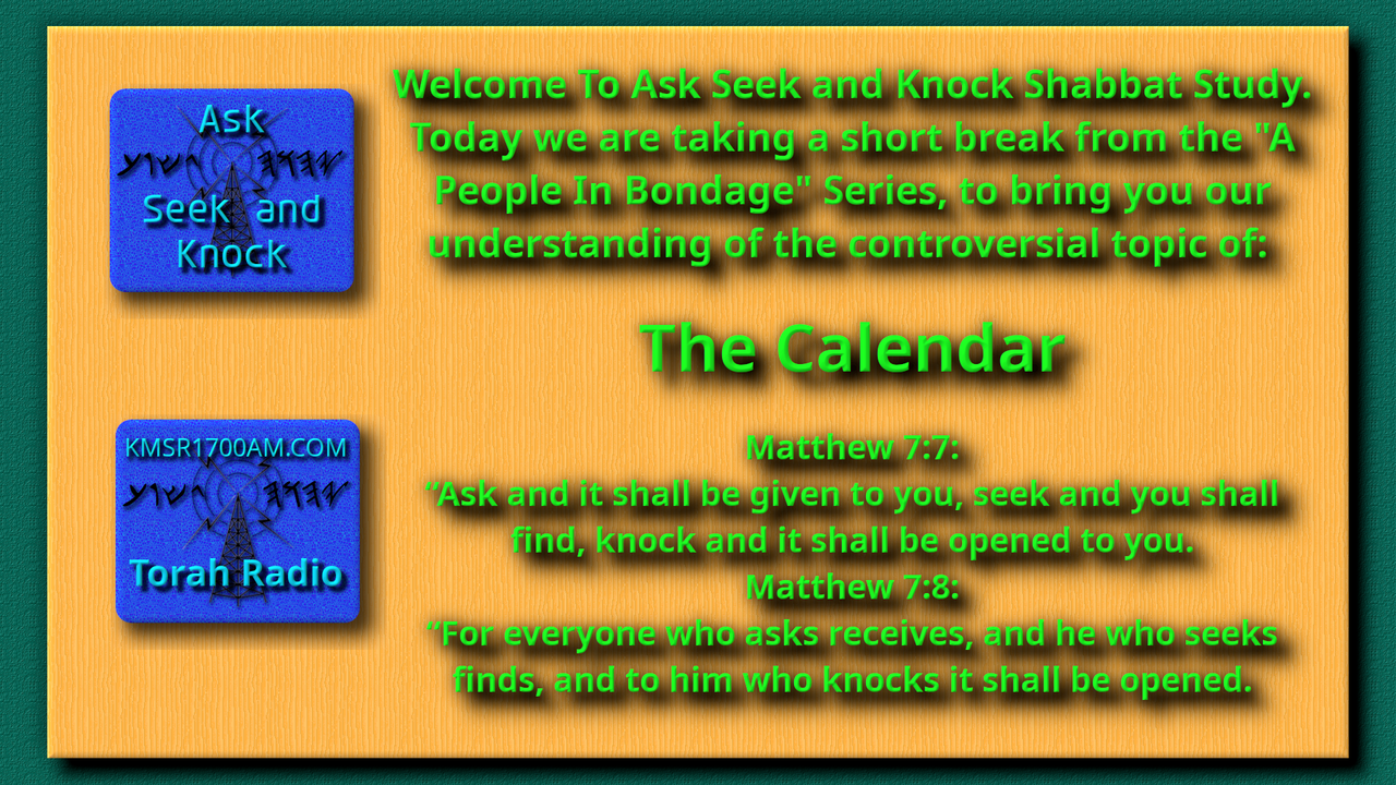 Shabbat Shalom and Thank you for Joining us with kmsr1700am.com for another addition of Ask Seek and Knock Shabbat Live Study. Today we will depart from the series “A People In Bondage” to bring you a study on “The Calendar”. We know that this is a controversial topic, however, it is important for us to get our assembly up to speed on what Two Feathers and I are using for our Calendar this year. We are not saying we are right and you are wrong, not at all, we are just saying this is where our studies have brought us at this point in time. Grab your highlighters and your Scriptures and lets get to it.