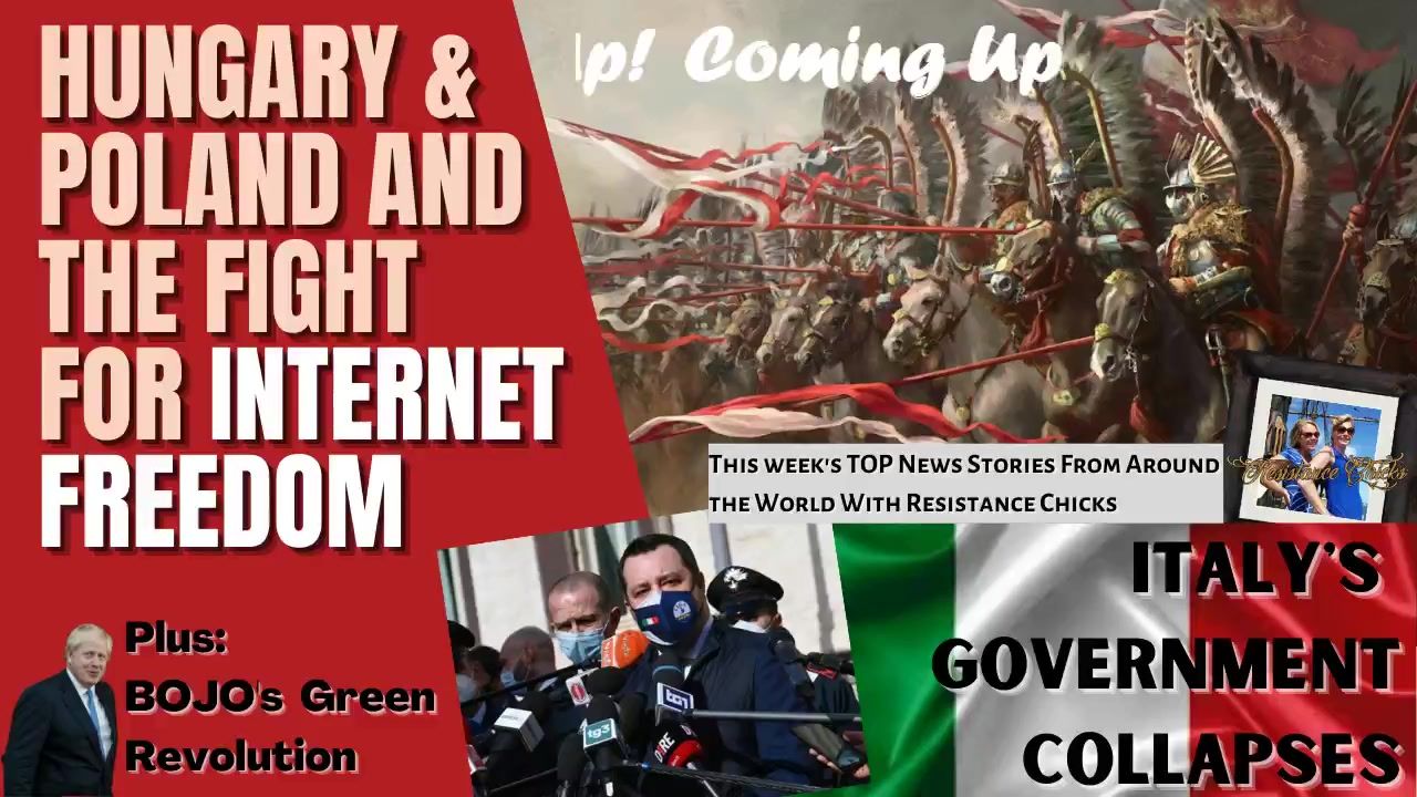On today's TOP news from around the world with #ResistanceChicks: #Hungary and #Poland are on the FRONT LINES for internet freedom, meanwhile, Italy's government collapses and #BorisJohnson starts a #greenrevolution ... all of that and MUCH MORE! Youtube channel down, live on Facebook, Periscope, DLive and Twitch!