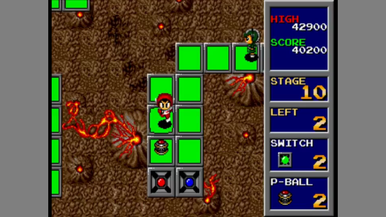The game is played from a top-down view. The goal is to make all switches in a level explode. A switch will exploded after a few seconds when you walk over it. If you or an enemy is on a switch when it explodes you/it will die. You can also kill enemies by hitting them with "P-balls" which can be collected in the levels.If a P-ball does not fall off the level grid, it can be recollected. Apart from throwing P-balls, you can jump. In each levels, there are trampolines. Jumping from a trampoline will make you jump higher. Landing on a trampoline will wear it off, which is indicated by changing colours. After several bounces, a trampoline will rip apart. If a P-ball lands on a trampoline, it will bounce to the next field, until it lands on a non-trampoline field or fall of the grid.