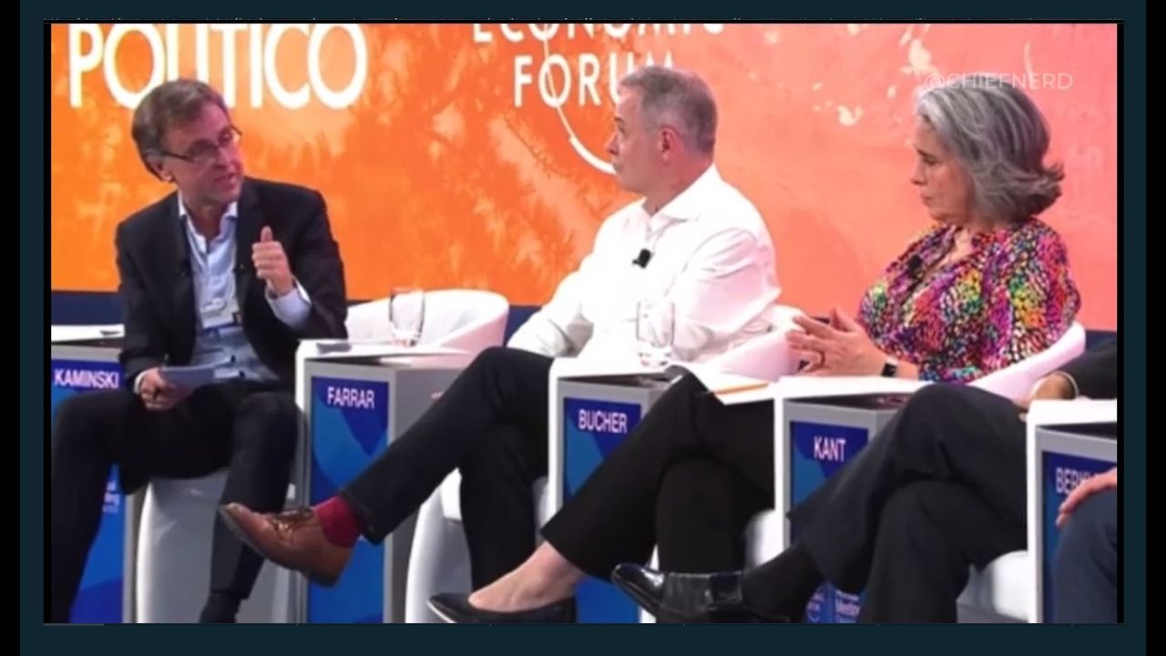 Gabriela Bucher is the executive director of Oxfam which is very critical of the pharma Covid windfall - she is criticising the people on the stage with her.