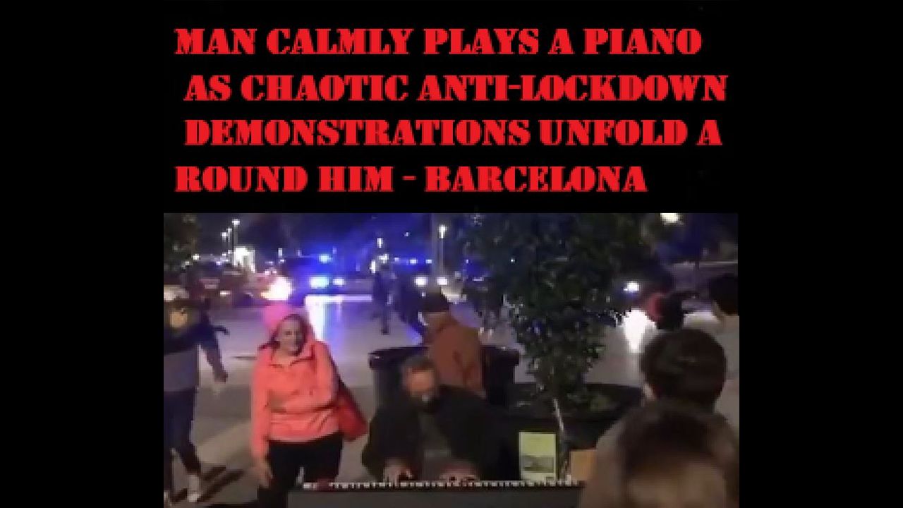 Man Calmly Plays A Piano As Chaotic Anti-Lockdown Demonstrations Unfold Around Him - Barcelona