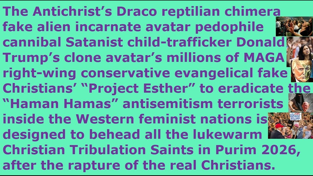 *** Intelligence news update from the Human Homo-Sapiens Race Survival Resistance (HRSR) and Republic Rebel Alliance battlefront (December 2025). The Antichrist’s Draco reptilian chimera fake alien incarnate avatar pedophile cannibal Satanist child-trafficker Donald Trump’s clone avatar’s millions of MAGA right-wing conservative evangelical fake Christians’ “Project Esther” to eradicate the “Haman Hamas” antisemitism terrorists inside the Western feminist nations is designed to behead all the lukewarm Christian Tribulation Saints in Purim 2026, who will be left behind on the earth after the rapture of the real Christians.