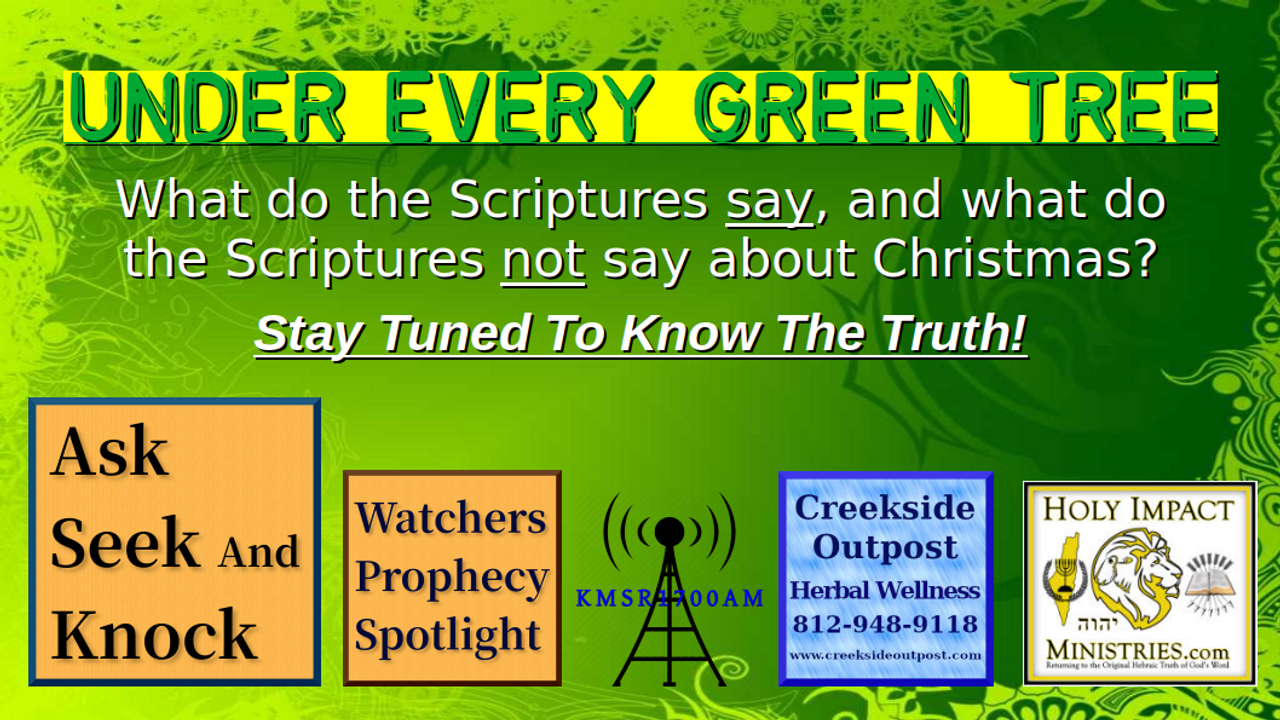 Thank you for joining us for “Ask Seek and Knock”. Today we will discuss the Topic “Under Every Green Tree”. We will unlock the truth about Christmas and just exactly what the Scriptures say about it. Grab your highlighters, a notebook, and a pen, as Yehovah empowers you with the truth about Christmas!