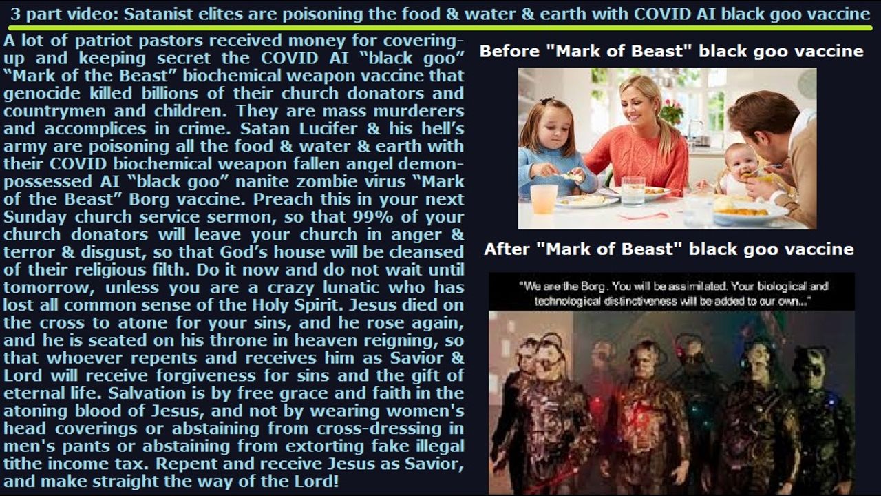 *** Intelligence news update from the Human Homo-Sapiens Race Survival Resistance (HRSR) headquarters and Republic Rebel Alliance battlefront (June 2024). Satan Lucifer & his hell’s army are poisoning all the food & water & earth with their COVID biochemical weapon fallen angel demon-possessed AI “black goo” nanite zombie virus “Mark of the Beast” Borg vaccine. Preach this in your next Sunday church service sermon, so that 99% of your church donators will leave your church in anger & terror & disgust, so that God’s house will be cleansed of their religious filth. Do it now and do not wait until tomorrow, unless you are a crazy lunatic who has lost all common sense of the Holy Spirit. Jesus died on the cross to atone for your sins, and he rose again, and he is seated on his throne in heaven reigning, so that whoever repents and receives him as Savior & Lord will receive forgiveness for sins and the gift of eternal life. Salvation is by free grace and faith in the atoning blood of Jesus, and not by wearing women's head coverings or abstaining from cross-dressing in men's pants or abstaining from extorting fake illegal tithe income tax. Repent and receive Jesus as Savior, and make straight the way of the Lord! End of transmission…