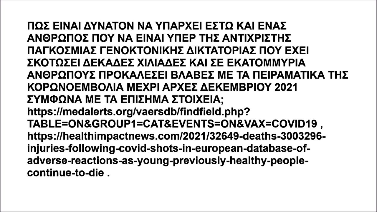 ΠΩΣ ΕΙΝΑΙ ΔΥΝΑΤΟΝ ΝΑ ΥΠΑΡΧΕΙ ΕΣΤΩ ΚΑΙ ΕΝΑΣ ΑΝΘΡΩΠΟΣ ΠΟΥ ΝΑ ΕΙΝΑΙ ΥΠΕΡ ΤΗΣ ΑΝΤΙΧΡΙΣΤΗΣ ΠΑΓΚΟΣΜΙΑΣ ΓΕΝΟΚΤΟΝΙΚΗΣ ΔΙΚΤΑΤΟΡΙΑΣ ΠΟΥ ΕΧΕΙ ΣΚΟΤΩΣΕΙ ΔΕΚΑΔΕΣ ΧΙΛΙΑΔΕΣ ΚΑΙ ΣΕ ΕΚΑΤΟΜΜΥΡΙΑ ΑΝΘΡΩΠΟΥΣ ΠΡΟΚΑΛΕΣΕΙ ΒΛΑΒΕΣ ΜΕ ΤΑ ΠΕΙΡΑΜΑΤΙΚΑ ΤΗΣ ΚΟΡΩΝΟΕΜΒΟΛΙΑ ΜΕΧΡΙ ΑΡΧΕΣ ΔΕΚΕΜΒΡΙΟΥ 2021 ΣΥΜΦΩΝΑ ΜΕ ΤΑ ΕΠΙΣΗΜΑ ΣΤΟΙΧΕΙΑ; http://alturl.com/jqway (SHORT URL OF USA Medalerts Org Vaers FOR COVID-19 VACCINE ALERT CASES) , https://healthimpactnews.com/2021/32649-deaths-3003296-injuries-following-covid-shots-in-european-database-of-adverse-reactions-as-young-previously-healthy-people-continue-to-die .