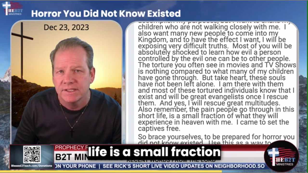 Rick's Alone Time From God - Dec 23, 2023: Sometimes, I have to show the horrors of the world and let people’s world shake before they will choose to seek me. This is what I am doing right now, my children. Many people will come to me after they understand true evil. There are many ways I can accomplish my purposes, but I want to shake my children who are not walking closely with me. #GodsShaking #FreeChoice #HorrosoftheWorld
