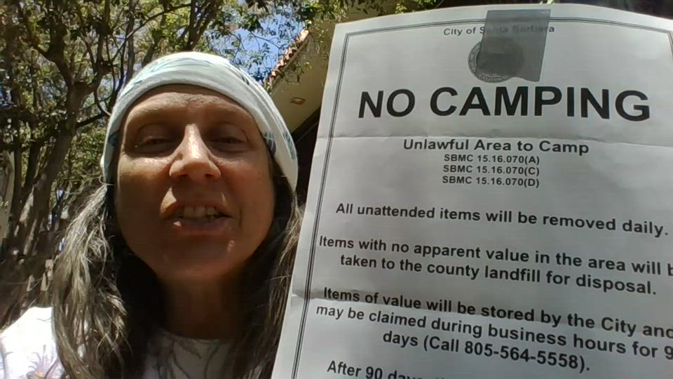 Santa Barbara's new No Camping in the park ordinance notice which was attached to her tent is shown. SBMC 15.16.070. Photos of homeless people on the streets of Santa Barbara, CA are shared.