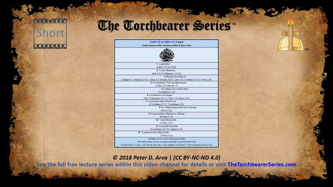 Download the PDF: https://www.thetorchbearerseries.com/pdf-jpg/GOD%20TEACHES%20US%20-%20Twelve%20Reasons%20Why%20Christians%20Suffer.pdf