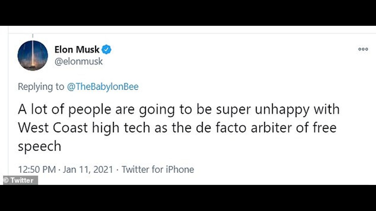 The Tesla and SpaceX CEO had replied to a satirical tweet about Twitter and Facebook banning Donald Trump from their platforms. Twitter also permanently banned Trump loyalists as part of a broader purge of accounts.