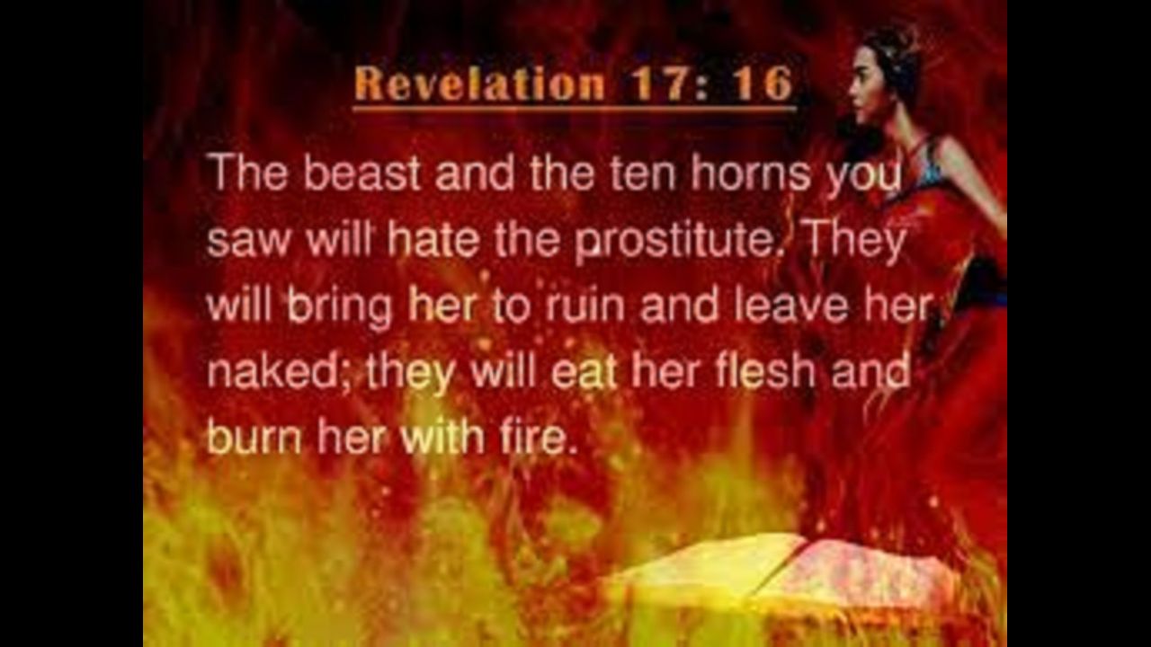 And the ten horns which thou sawest upon the beast, these shall hate the whore, and shall make her desolate and naked, and shall eat her flesh, and burn her with fire.