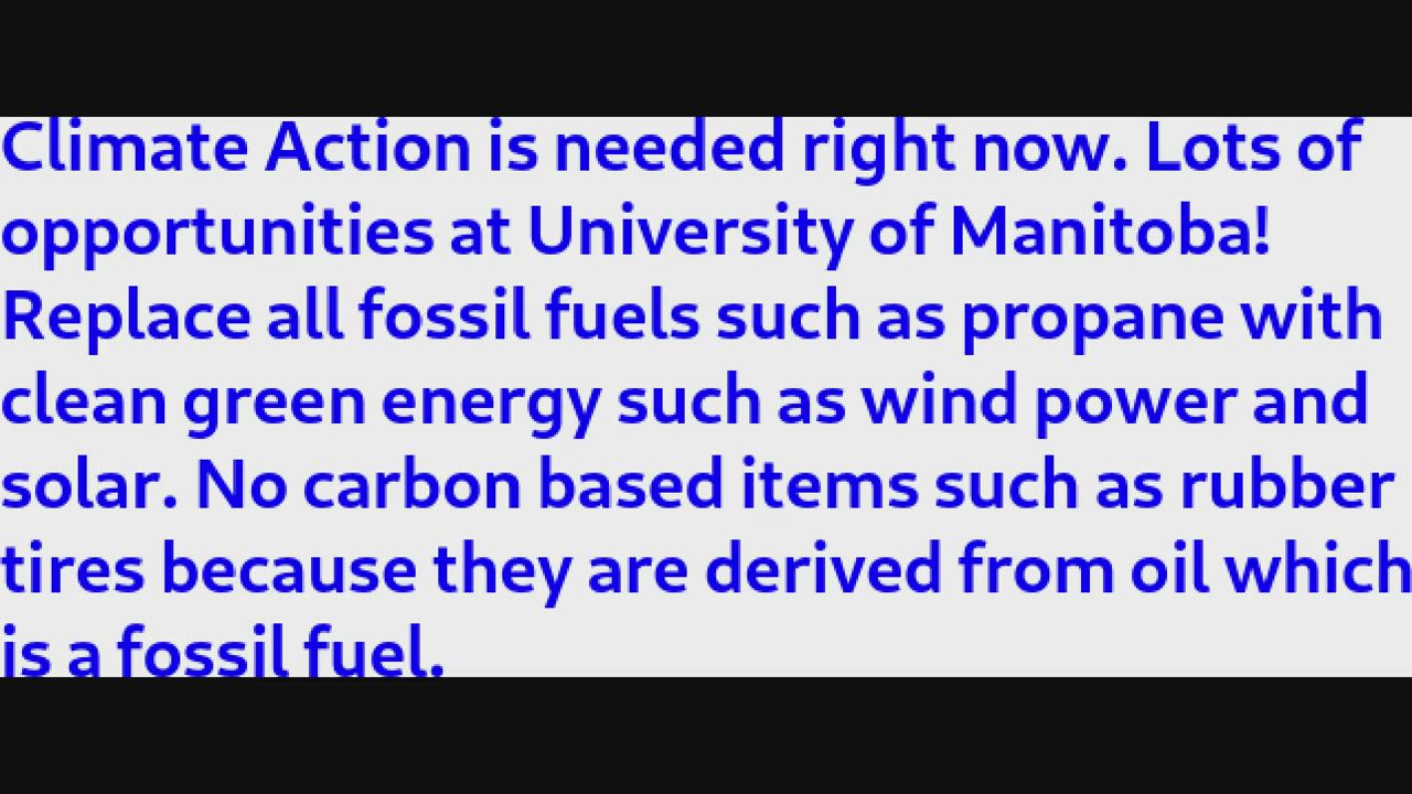 We are in a CLIMATE EMERGENCY. This is the first of many video showing how the University of Manitoba can show us thew way out of the emergency and into a clean green future. No fossil fuels or carbon products at the University of Manitoba. No rubber tires, no paper from wood, no asphalt for roads, no fossil fuels for heating. Its time to stop talking and time for problem solving