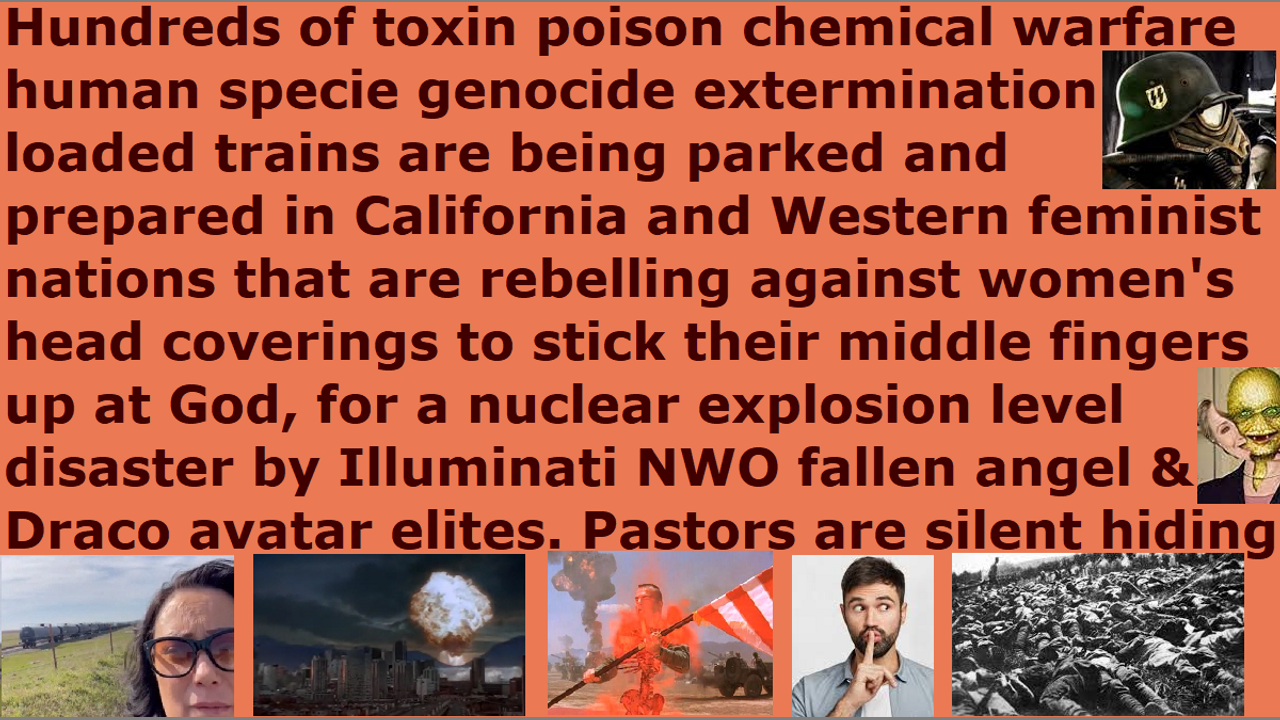 *** Intelligence news update from the Human Homo-Sapiens Race Survival Resistance (HRSR) headquarters and Republic Rebel Alliance battlefront (February 2023). Hundreds of toxin poison chemical warfare human specie genocide extermination loaded trains are being parked and prepared in California and Western feminist nations that are rebelling against women's head coverings to stick their middle fingers up at God, for a nuclear explosion level disaster by the Illuminati NWO fallen angel Pleiadian fake aliens incarnate avatar & Draco reptilian chimera fake aliens incarnate avatar elites. Pastors are silent, hiding all of this, out of fear of assassination attempts and ridicule by church donators as lunatic heretic idiotic narcotic maniacs. The blood of millions of people are on their hands as fake “Bible’s watchman on the wall.” They worship pastors’ reputations and pastors’ salaries and safety from assassinations over other genetically-unrelated total stranger people’s lives and safety and warning. The Western feminist nations are under God’s judgment by sword & famine & plague & demon armies, because they redefined hundreds of Bible verses to remove all of God’s protection and replace Jesus with hundreds of fake foreign gods to get church donations, in order to bring back millions of “human extermination” fallen angel devils back from the abyss. When the End Times generation and Western feminist nations’ apostate harlot Church becomes utterly evil, then they allow demons and devils in cloned hybrid human avatar bodies and stolen “walk in” human New Age Wicca witch Satanist servants’ bodies to take over their Western feminist nations’ society. Satan Lucifer’s fake unbiblical job positions “pastors” are allowing the death of millions of their church donators and other Western feminist nations’ “women’s equality” “female church donators loving” “Jezebel spirit filled” “Satan Lucifer’s ordained & allowed & trained” church pastors and religious Christian hordes, who are redefining Bible verses and rebelling against women’s head coverings so that their heads are controlled by the fallen angels to stick their middle fingers up at God, and cross-dressing in “Satan Lucifer’s post-1960s cross-dress-project” men’s trousers to mock God’s Word, and stealing unbiblical post-1873 10% salary tithe income taxes to make God’s house into an extortionist gangster’s office, and doing hundreds of other things to remove all of God’s protection and replace Jesus with Jezebel & Sananda Jesus & Mammon & Adephagia, in order to bring judgment upon their Western feminist nations with sword & famine & plague & demon armies. They will have their uncovered women’s heads shaved, and their cross-dressing men’s trousers ripped off to be raped, and their stolen 10% tithe income taxes confiscated, and their genitals castrated, and their animal-instinct’s genetic-descendant idols children confiscated to be tortured & lesbian raped (pegged) & sacrificed & eaten by the reptilian hybrid elites. Preach this in your next Sunday church service sermon, so that 99% of your church donators will leave your church in terror & disgust & anger, so that God’s house will be cleansed of their religious filth. Do it now and do not wait until tomorrow, unless you are a crazy lunatic who has lost all common sense of the Holy Spirit. Repent and receive Jesus as Savior, and make straight the way of the Lord! End of transmission…