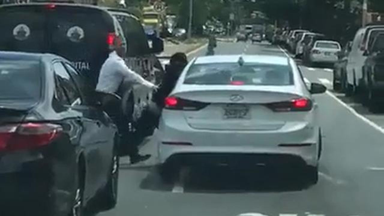 Just scrape them off on the next car in line. Squished him so hard his shoes came off. There is usually pain involved when your shoe gets scraped off of you. It seems like it is never a good idea to reach into a car and try to assault and or rob a driver. The car usually always wins.