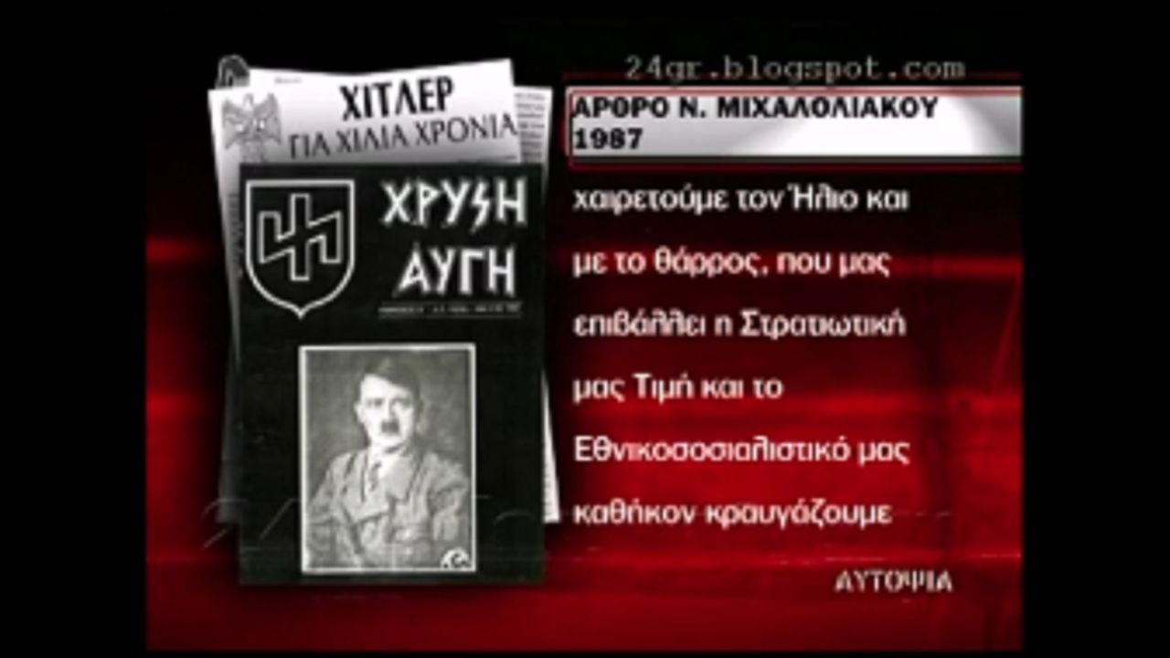 Γιατί το λεγόμενο δημοκρατικό πολιτικό σύστημα έδωσε άδεια ίδρυσης κόμματος σε ένα ναζιστικό χιτλερικό δικτατορικό μόρφωμα, ΠΟΥ ΔΕΧΕΤΑΙ ΤΗΝ "ΤΡΙΤΗ ΙΔΕΟΛΟΓΙΑ" ΤΟΥ ΕΘΝΙΚΟΣΟΣΙΑΛΙΣΜΟΥ-ΝΑΖΙΣΜΟΥ, όπως το δήλωνε στην Ταυτότητα της Ιδεολογίας του στην Επίσημη ιστοσελίδα του https://web.archive.org/web/20121002024914/http://www.xryshaygh.com/index.php/kinima : "1) Δέχομαι την τρίτη μεγάλη ιδεολογία της Ιστορίας, την πιο ριζωμένη στο ιστορικό παρελθόν του Λαού μου. Το ίδιο ενάντια στον κομμουνισμό-διεθνισμό όσο και στον φιλελευθερισμό-οικουμενισμό. 3)... Έτσι είμαι εχθρός κάθε εξουσίας που διαιωνίζει αυτή τη σήψη που ‘χει για στήριγμά της την πλουτοκρατία. Κάθε εξουσίας, είτε δικτατορία των στρατιωτικο-οικονομικών συμφερόντων είναι, είτε δικτατορία του κοινοβουλευτισμού. Γιατί είναι δύο όψεις του ίδιου νομίσματος: του αντεθνικού ισοπεδωτισμού".