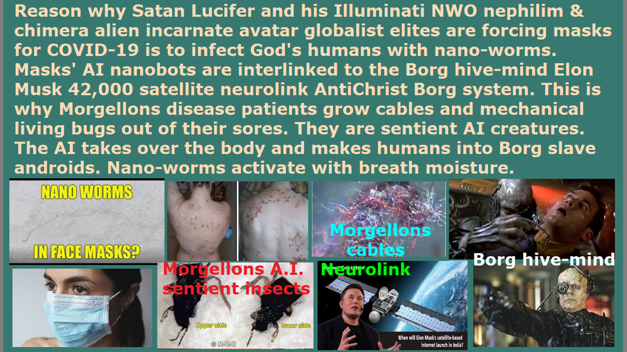 Reason why Satan Lucifer and his Illuminati NWO nephilim & chimera alien incarnate avatar globalist elites are forcing masks for COVID-19 is to infect God's humans with nano-worms. Masks' AI nanobots are interlinked to the Borg hive-mind Elon Musk 42,000 satellite neurolink AntiChrist Borg system. This is why Morgellons disease patients grow cables and mechanical living bugs out of their sores. They are sentient AI creatures. The AI takes over the body and makes humans into Borg slave androids. Nano-worms activate with breath moisture. The AI insects and worms and cables grow using the human’s energy and nourishment. End of transmission…