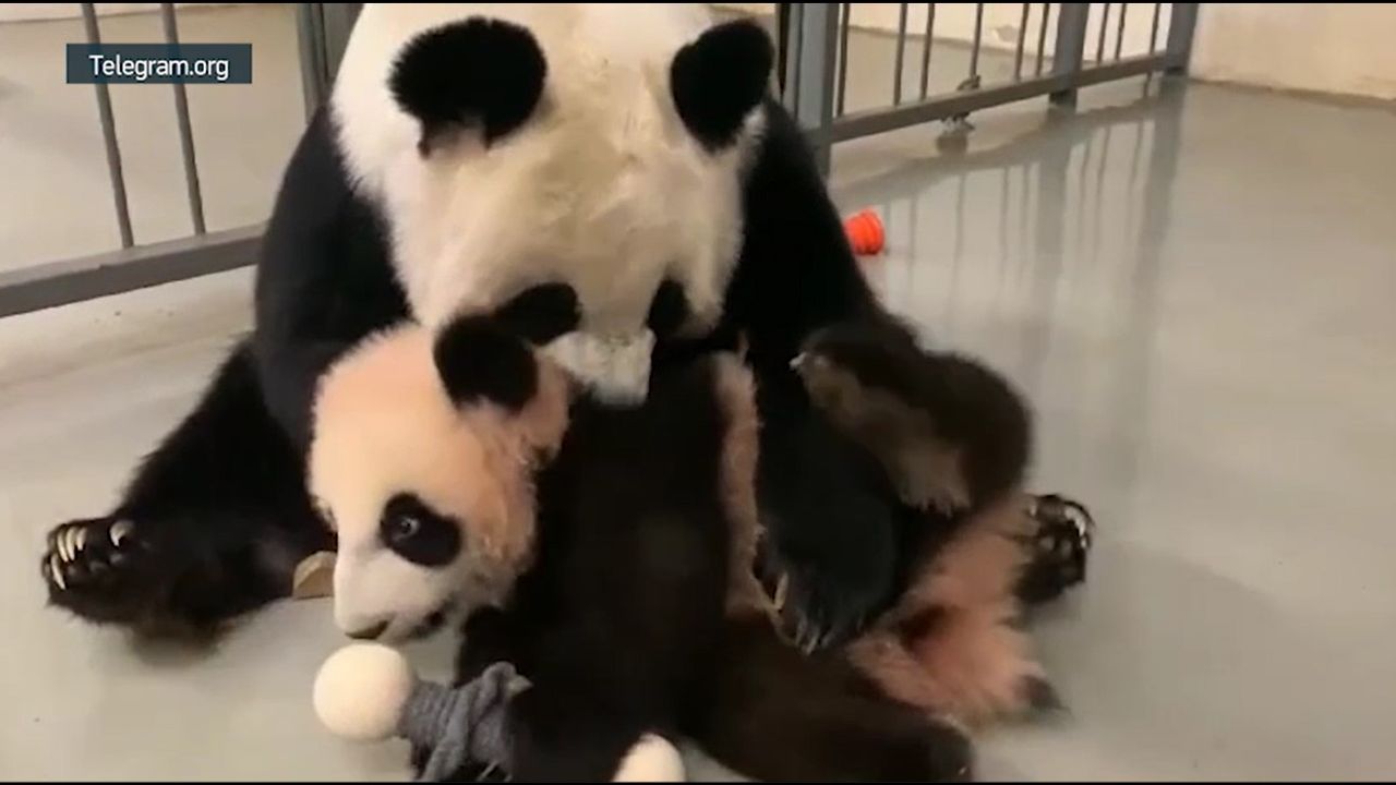 Playtime with Mama Panda and Baby Katyusha. From Russian Zoo.