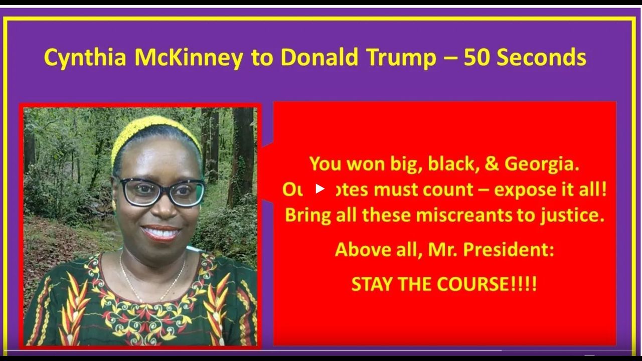 BOOM BOOM BOOM! This is the 50 second distillation of the 20 minute video made by Dr. Cynthia McKinney to help President Donald Trump generally (STAY THE COURSE) and with Georgia which she knows better than anyone else now working for President Trump.