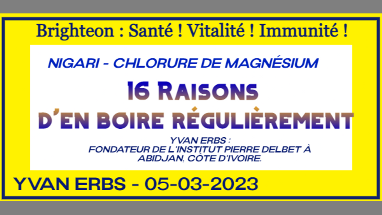 CHLORURE DE MAGNÉSIUM :16 REPONSES A PROPOS DE LA TECHNOLOGIE ÉVOLUTIVE LA PLUS AVANCÉE AU MONDE PAR YVAN ERBS, FONDATEUR DE L'INSTITUT PIERRE DELBET À ABIDJAN, CÔTE D'IVOIRE.► https://www.institutpierredelbet.org/