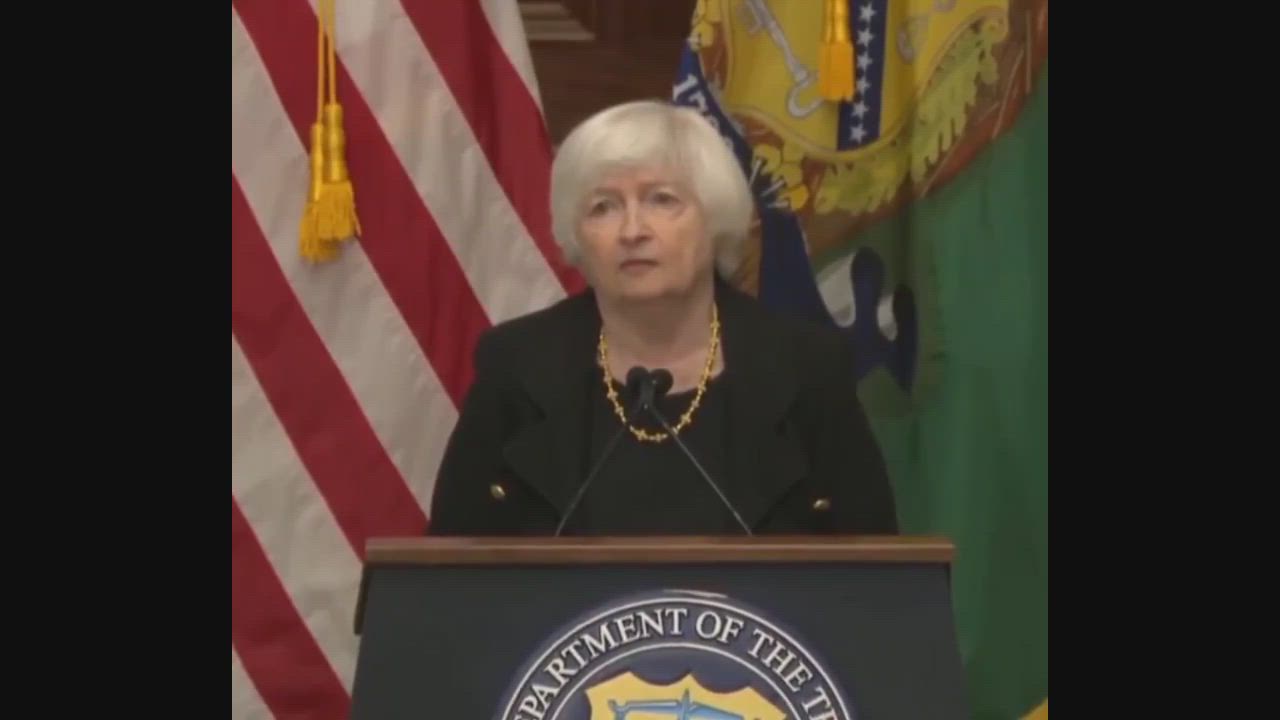 A reporter asked Janet Yellen how concerned she was about the dollar's current status as the world's reserve currency, but her podium answered before she could. The Department of Treasury Seal fell to the floor.