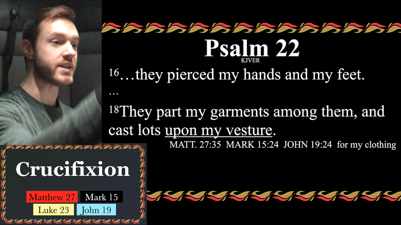 Matthew 27:35 & 36, Mark 15:24, Luke 23:34, John 19:23 & 24 combined