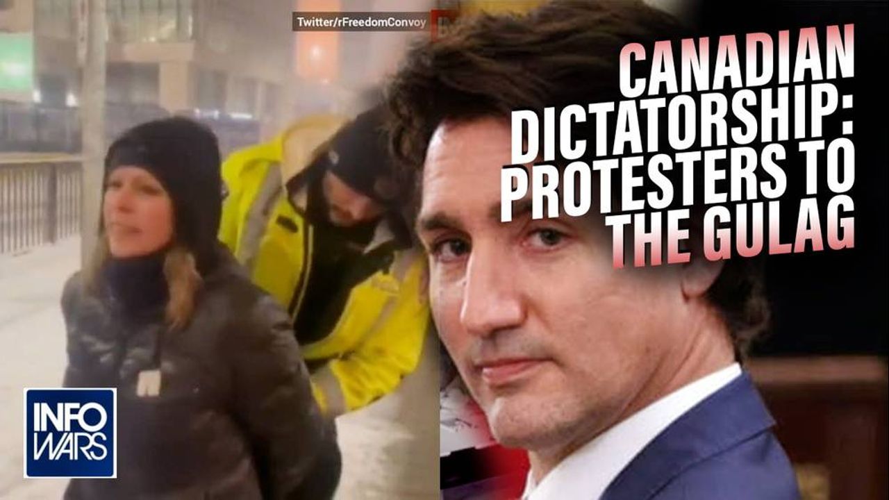 Alex Jones breaks down the implementation of a Canadian dictatorship strangling the voice of peaceful protesters as they are arrested and denied bail for standing up to their authoritarian overlords.