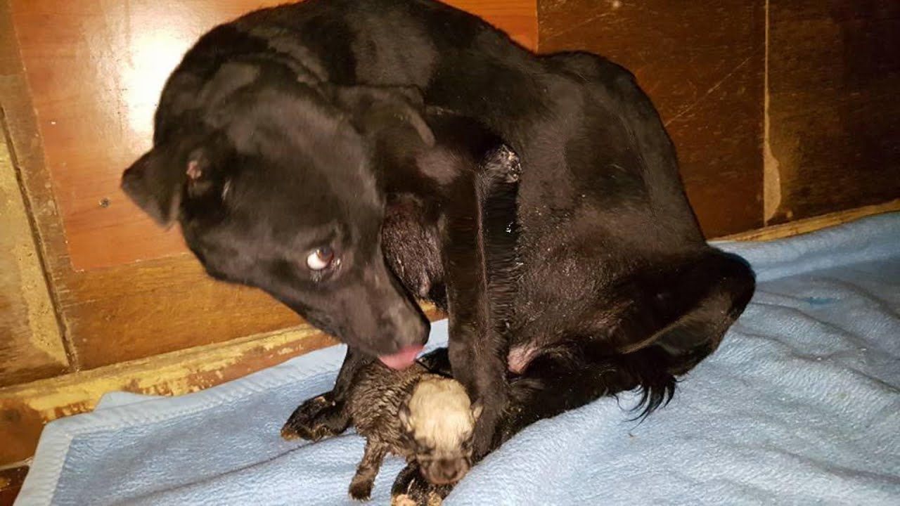 Terrified mom her eyes full of fear try to keep her only survivied puppy safe from human!