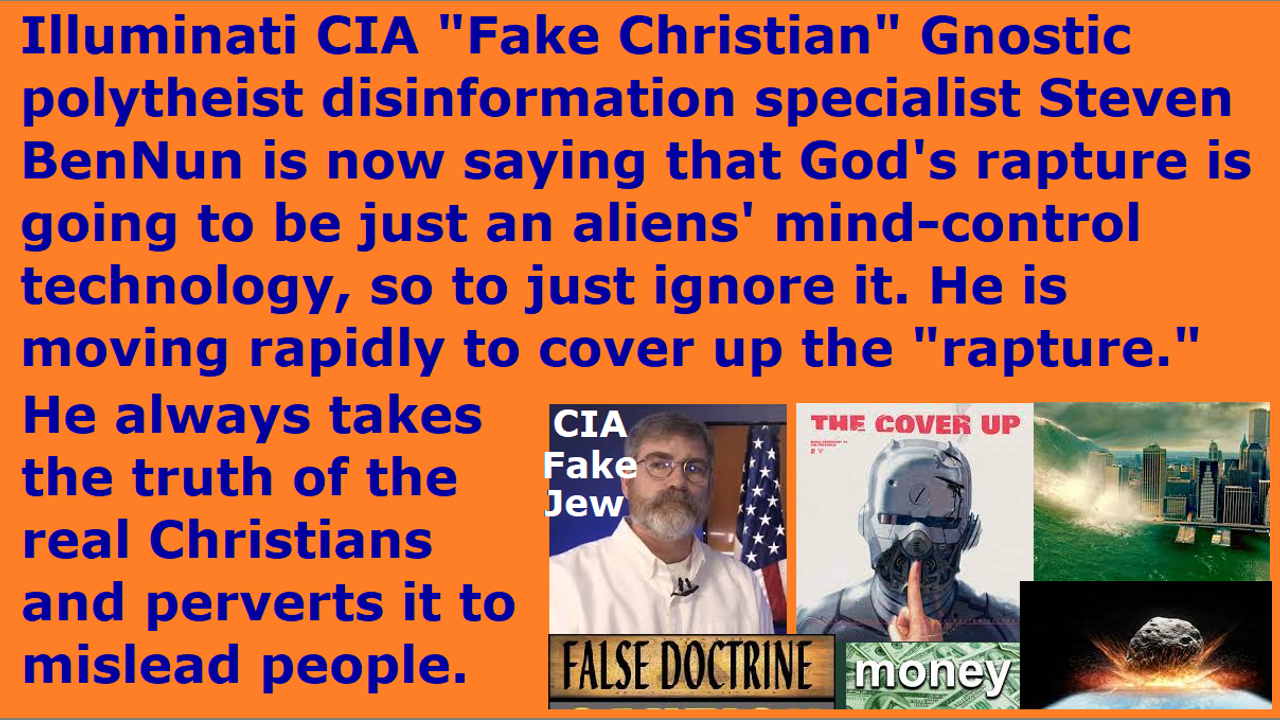 Just as I had been saying all along, the CIA New Age Gnostic polytheist “fake Christian” Steven BenNun (fake Jewish name) and Jana BenNun (uses dozens of different names including Spanish names) are the CIA’s Satanist disinformation specialists. They are now saying that the “rapture of the real Christians is going to be just mind-control technology by the Illuminati, so just ignore it because it is not real. He is moving to cover up the “rapture.” He always takes the truth that the real Christians preach, and perverts it to false doctrines and cover-ups and diversions, so it becomes obvious after a few hundred times. Satan Lucifer’s fallen angel “fake alien” fathers and their nephilim & chimera “fake alien” children were scanning my brain just now, so they are concerned about what I am writing right now to expose their deceptions.