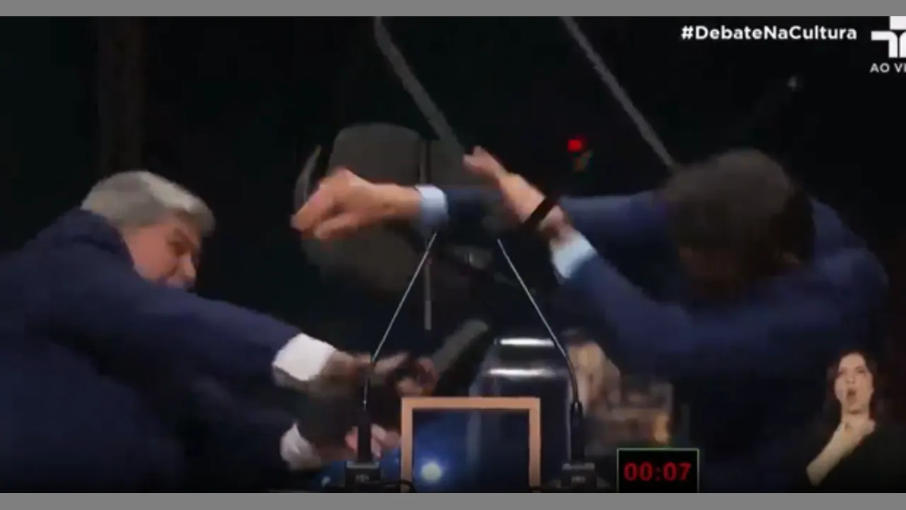 Shock footage shows Jose Luiz Datena launching a heavy stool at political rival Pablo Marcal
