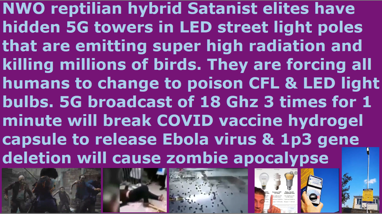 *** Intelligence news update from the Human Homo-Sapiens Race Survival Resistance (HRSR) headquarters and Republic Rebel Alliance battlefront (July 2022). People are discovering that the fake COVID19 Coronavirus 5G remote assassination weapons are hidden in the LED light poles in every neighborhood. They are preparing to kill billions of people just like in their test at Wuhan China on all the people who were vaccinated with COVID19 test vaccine, where 5G was first kicked off in the world. The 5G towers are emitting horrific amounts of electromagnetic radiation, and millions of birds are falling from the sky dead and millions of fish are washing up on shore dead. The CFL and LED lights are destroying your body’s frequency. They are harmful to your eyes and skin and endocrine system. This is why they are prohibiting normal light bulbs now, and forcing people to buy poisonous CFL and LED lights. The 5G broadcast of 18 Ghz 3 times for one minute from these 5G street LED light poles will make the nanoparticles in the COVID19 vaccine to expand, and the capsules in the vaccine’s hydrogel in the vaccinated people will break to release the zombie Ebola Marburg virus biochemical weapon nanites and its 1p3 gene deletion to create a zombie apocalypse to kill billions of people. The fallen angel devils will kill their own people, too. The fallen angels are enjoying killing everyone. They are genocidal psychopaths. The pastors and religious Christians will not tell you any of this, because they are afraid of assassinations and ridicule from church donators, and getting hit with diabetes attacks and all kinds of attacks, and they are fake “watchmen on the wall.” End of transmission…