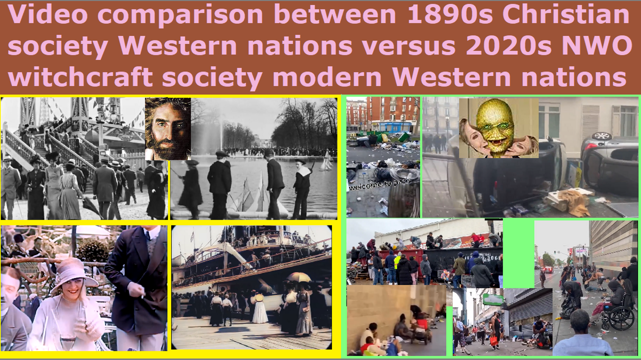 *** Intelligence news update from the Human Homo-Sapiens Race Survival Resistance (HRSR) headquarters and Republic Rebel Alliance battlefront (May 2023). Attached is the video comparison between the 1890s Paris and 1911 & 1930 New York prosperous Christian society based on Christian “Bible based, women’s head coverings, women’s dress wearing” populace that was blessed by God versus the 2020s Paris and New York and San Francisco and Los Angeles and Seattle accursed “Bible verses redefining, women’s head coverings rebelling, fallen angel head controlled, men’s pants cross-dressers” Western feminist nations that is the center of reptilian hybrid pedophile cannibal Satanist witch feminist earth’s hidden matriarchal rulers witchcraft society. The Western feminist nations now have more witches and more witchcraft than Africa and Southeast Asia does. Satan Lucifer’s millions of Western feminist nations’ harlot churches’ “women’s equality” “female church donators loving” “Jezebel spirit filled” “Satan Lucifer’s ordained & allowed & trained & non-assassination-attempts-receiving” church pastors and religious Christian hordes, who are redefining Bible verses and rebelling against women’s head coverings so that their heads are controlled by the fallen angels to stick their middle fingers up at God, and cross-dressing in “Satan Lucifer’s post-1960s cross-dress-project” men’s trousers to mock God’s Word, and stealing from God and his real Christians apostles & elders 50% off the top of all their unbiblical post-1873 10% salary old laws illegal tithe income taxes for their church staff’s and pastor’s illegal monthly salaries and medical science witchcraft health insurance benefits to make God’s house into an extortionist gangster’s office, and doing hundreds of other things to remove all of God’s protection and replace Jesus with Jezebel & Sananda Jesus & Mammon & Adephagia, in order to bring judgment upon their Western feminist nations with sword & famine & plague & demon armies, are thinking and acting and living just like the heathens outside the churches. There is no difference between the ideologies and mentalities of the fake Christians and the fake pastors compared to the Western feminist nations’ heathen non-believers. The only difference is that one goes to Satan Lucifer’s churches and the other goes to Satan Lucifer’s bars and sports games. You cannot tell the difference between a heathen Western woman and a church-going Western woman, because they both spiritually smell the same. This is why the witches can infiltrate the millions of churches and feed the church members their kidnapped children’s human meat in the church food, because the witches fit in perfectly inside the churches, and there is no difference between the church human women and the reptilian hybrid church witches. If it was a real church, then the real Christian women have the Holy Spirit, so they behave feminine, and the witches would be identified immediately as witches because they act like Western women. Nowadays, after Satan Lucifer’s 1960s “women’s rebellion witchcraft demon-spirit infusion into children,” most of the Western feminist nations’ women have the Jezebel demon spirit inside their bodies, so all behave like witches, and that is why the reptilian hybrid witches can infiltrate 33.3% of the Western feminist nations’ population without being discovered. The characteristic of a nation that is saturated by witchcraft in politics and corporations and churches and military and courts and schools and media is a nation that has declined to a poor, crime-filled, violent, dirty, slum-like, LGBTPB (lesbian gay bisexual transvestite pedophile bestiality) orgy child sex magick ritual reptilian hybrid & ape hybrid Satanist New Age Wicca witch occult witchcraft culture and society and civilization.