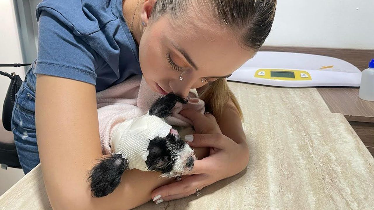 On Christmas Eve, a woman found an abandoned puppy in front of the Church. Without hesitation, out of her compassion, she brought the baby to the Vet. He was almost unconscious, just closing his eyes to endure the pain.