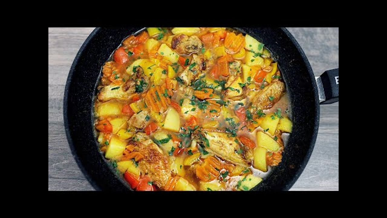 Geschmorte Kartoffeln mit Huhn und Gemüse in einer Pfanne